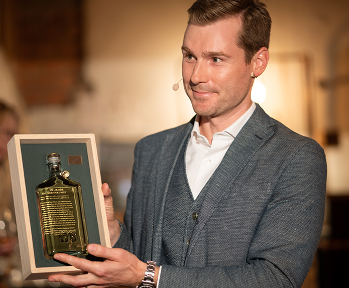 Von der edlen Vierkant-Flasche, über den hochwertigen Eichenholzkarton bis zum Schuber mit dem Jubiläums-Keyvisual präsentiert sich die Verpackung als haptisches und optisches Gesamterlebnis, das die Exklusivität des Inhaltes hervorhebt. Die edle Vierkant-Flasche ist handsigniert und mit einem Goldsiegel verplombt. Die individuelle Editions Nummerierung macht jedes Exemplar zu einem Einzelstück. Sie reist in einer hochwertigen Eichenholzkiste zum Kunden, geschützt durch einen mit einer Collage des Künstlers Olaf Hajek versehenen Schuber. Unsere Schladerer Jubiläumsedition ist für 475,00 € erhältlich. Bestellungen nimmt das Team unter info@schladerer.de oder telefonisch unter +49 7633 832-0 entgegen.
